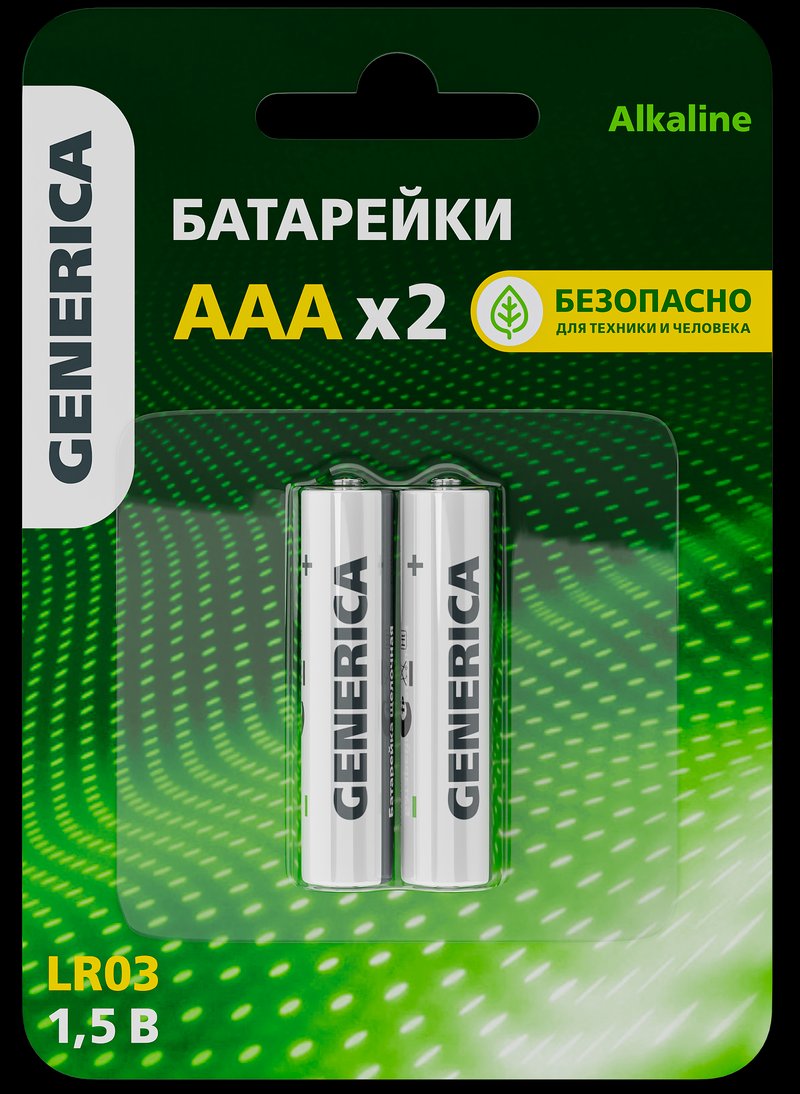 Батарейки щелочные мизинчиковые GENERICA AAA / LR03, 2 шт. на блистере. Батарейки Generica созданы с использованием широко распространённых технологий. Это позволило достичь идеального баланса между ценой и качеством. Батарейки Generica производятся в соответствии с международным стандартом IEC и проходят контроль качества для каждой партии. Батарейки подходят для использования в часах, игрушках, пультах, кухонных и напольных весах, фонарях, игровых консолях, компьютерных мышках, клавиатуре, счетчиках газа, воды, электрических щетках и других устройствах. Соответствуют ГОСТ 12.2.007.12, ГОСТ 24721, ГОСТ Р МЭК 60086-1 (IEC 60086-1).
