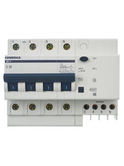 Диф. автомат АД14 4Р 32А 30мА GENERICA