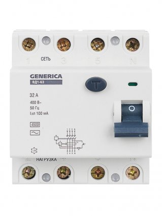 Быстродействующий защитный выключатель ВД1-63 (УЗО) GENERICA - устройство электронного типа, зависящее от напряжения и реагирующее на дифференциальный ток, без встроенной защиты от сверхтоков. Предназначен для защиты человека от поражения электрическим током.