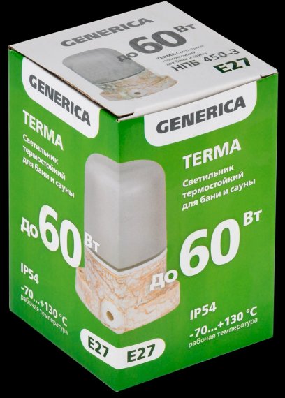 Светильник НПБ серии 450 торговой марки GENERICA предназначен для применения в бытовых помещениях с высоким содержанием пыли и влаги, а так же с предельной температурой окружающей среды до 140 °С, например в банях и саунах. Светильник имеет полностью керамический корпус и стеклянный плафон, что обеспечивает высокую термическую надёжность, а так же приятный внешний вид. Для уплотнения соединения между корпусом и рассеивателем используется силиконовая прокладка способная выдержать длительную эксплуатацию при высоких температурах, при этом не происходит деформация и высыхание на всем гарантийном периоде эксплуатации. Некоторые модели светильников могут быть использованы для сквозной проводки, так как имеют 2 гермоввода. Светильники имеют три вида цветового исполнения: классический белый, насыщенный шоколадный (коричневый) и узорный мраморный! Так же мы предлагаем 3 вида корпуса: классический прямой, наклонный под 45° и угловой.