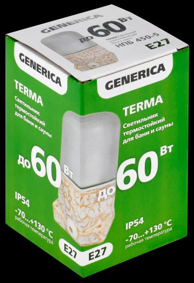Светильник НПБ серии 450 торговой марки GENERICA предназначен для применения в бытовых помещениях с высоким содержанием пыли и влаги, а так же с предельной температурой окружающей среды до 140 °С, например в банях и саунах. Светильник имеет полностью керамический корпус и стеклянный плафон, что обеспечивает высокую термическую надёжность, а так же приятный внешний вид. Для уплотнения соединения между корпусом и рассеивателем используется силиконовая прокладка способная выдержать длительную эксплуатацию при высоких температурах, при этом не происходит деформация и высыхание на всем гарантийном периоде эксплуатации. Некоторые модели светильников могут быть использованы для сквозной проводки, так как имеют 2 гермоввода. Светильники имеют три вида цветового исполнения: классический белый, насыщенный шоколадный (коричневый) и узорный мраморный! Так же мы предлагаем 3 вида корпуса: классический прямой, наклонный под 45° и угловой.