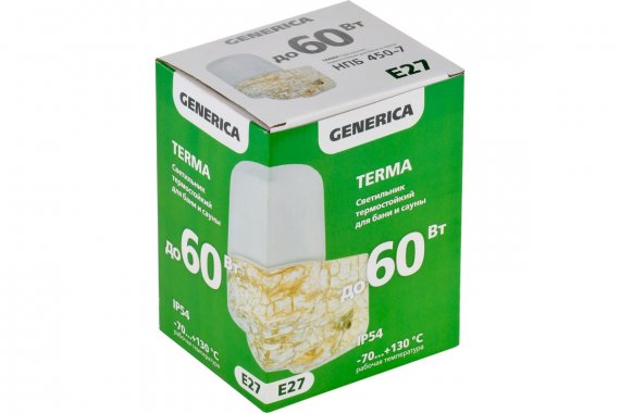 Светильник НПБ серии 450 торговой марки GENERICA предназначен для применения в бытовых помещениях с высоким содержанием пыли и влаги, а так же с предельной температурой окружающей среды до 140 °С, например в банях и саунах. Светильник имеет полностью керамический корпус и стеклянный плафон, что обеспечивает высокую термическую надёжность, а так же приятный внешний вид. Для уплотнения соединения между корпусом и рассеивателем используется силиконовая прокладка способная выдержать длительную эксплуатацию при высоких температурах, при этом не происходит деформация и высыхание на всем гарантийном периоде эксплуатации. Некоторые модели светильников могут быть использованы для сквозной проводки, так как имеют 2 гермоввода. Светильники имеют три вида цветового исполнения: классический белый, насыщенный шоколадный (коричневый) и узорный мраморный! Так же мы предлагаем 3 вида корпуса: классический прямой, наклонный под 45° и угловой.