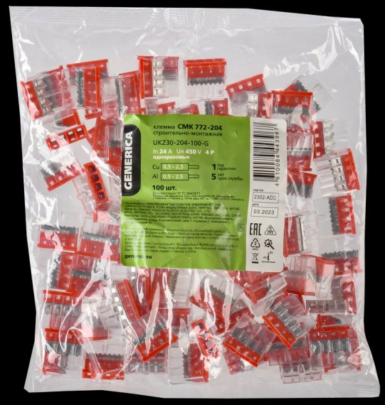 Клеммы строительно-монтажные типа СМК товарного знака GENERICA предназначены для соединения одножильных и многожильных проводников без использования инструмента в электрических сетях переменного и постоянного тока. Клеммы СМК 772 предназначены для подключения медных и алюминиевых проводников, являются одноразовыми.